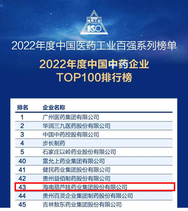 会议期间,一年一度的中国医药工业百强系列榜单隆重揭晓,304am永利集团药业集团凭借领先的研发优势和扎实的生产实力以及稳健的市场推广能力,连续第四年成功入选“2022年度中国中药企业TOP100排行榜” ,排名稳步上升至第43位。